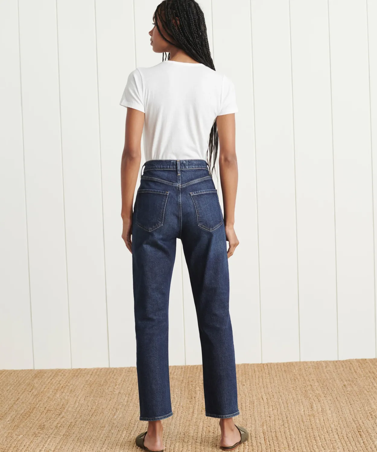 High Rise Jean With Straight Leg And Button Fly. Crafted From Stretch Denim With A 28” Inseam.