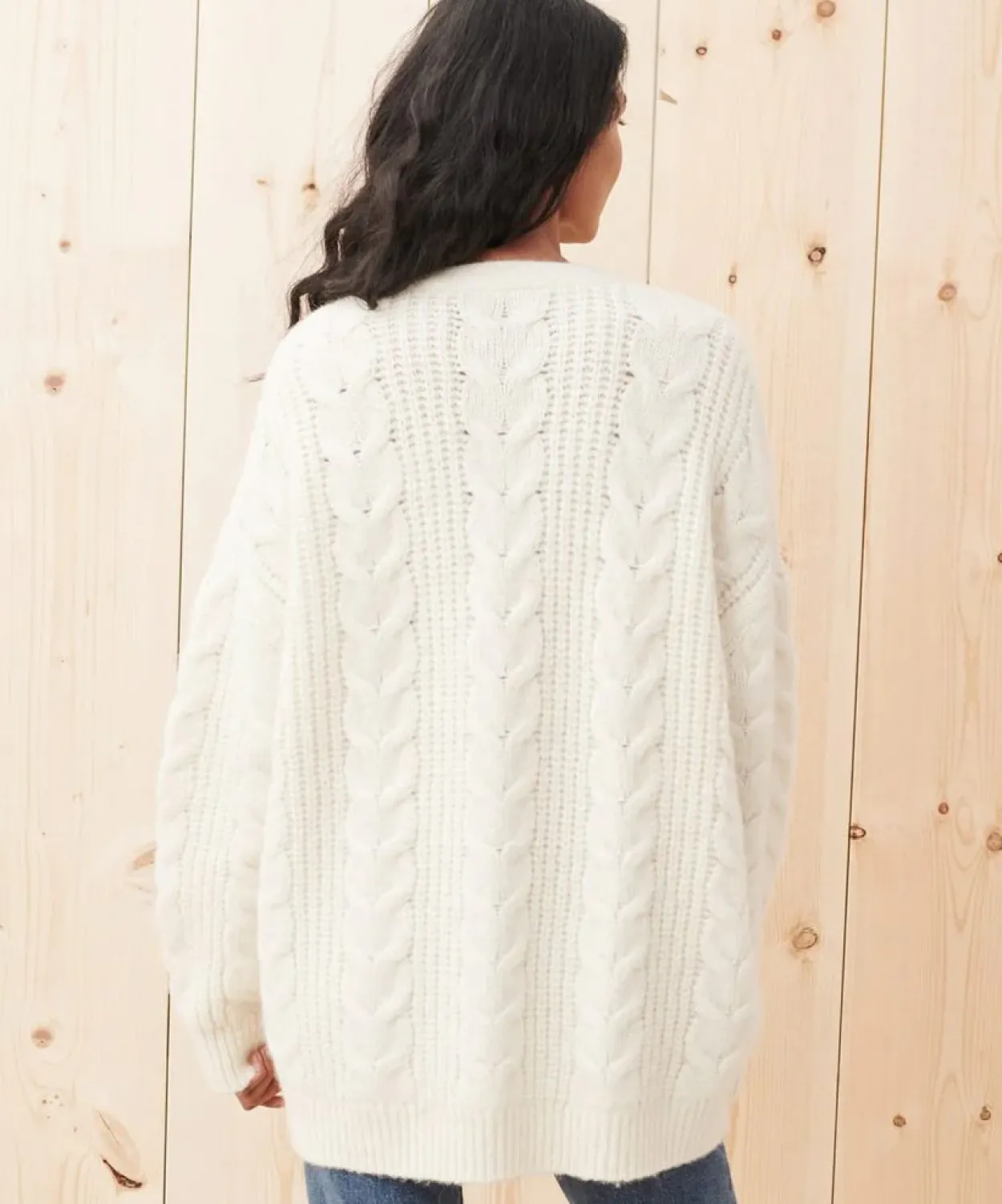 Lofty Cable Knit Sweater With A Relaxed Silhouette. Faux-Horn Buttons.