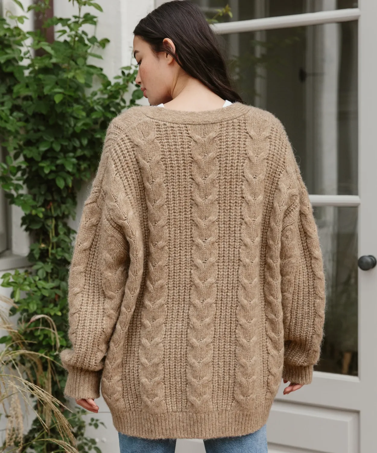 Lofty Cable Knit Sweater With A Relaxed Silhouette. Faux-Horn Buttons.